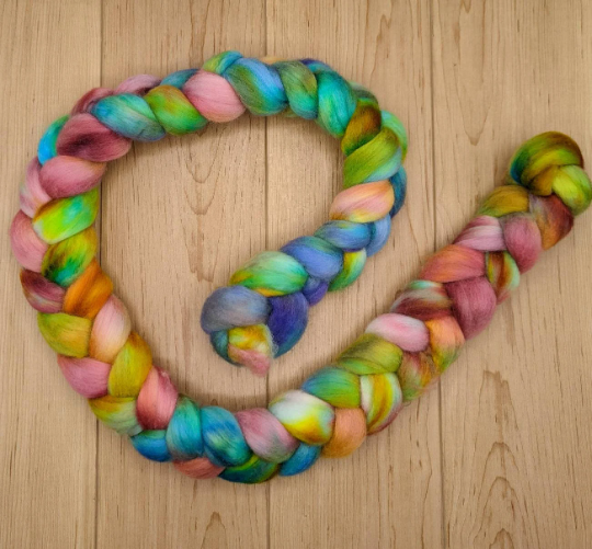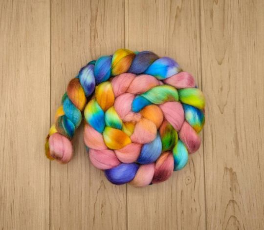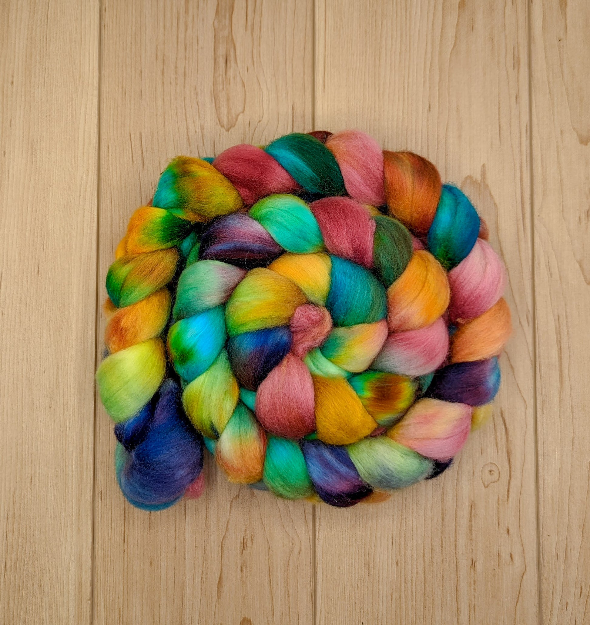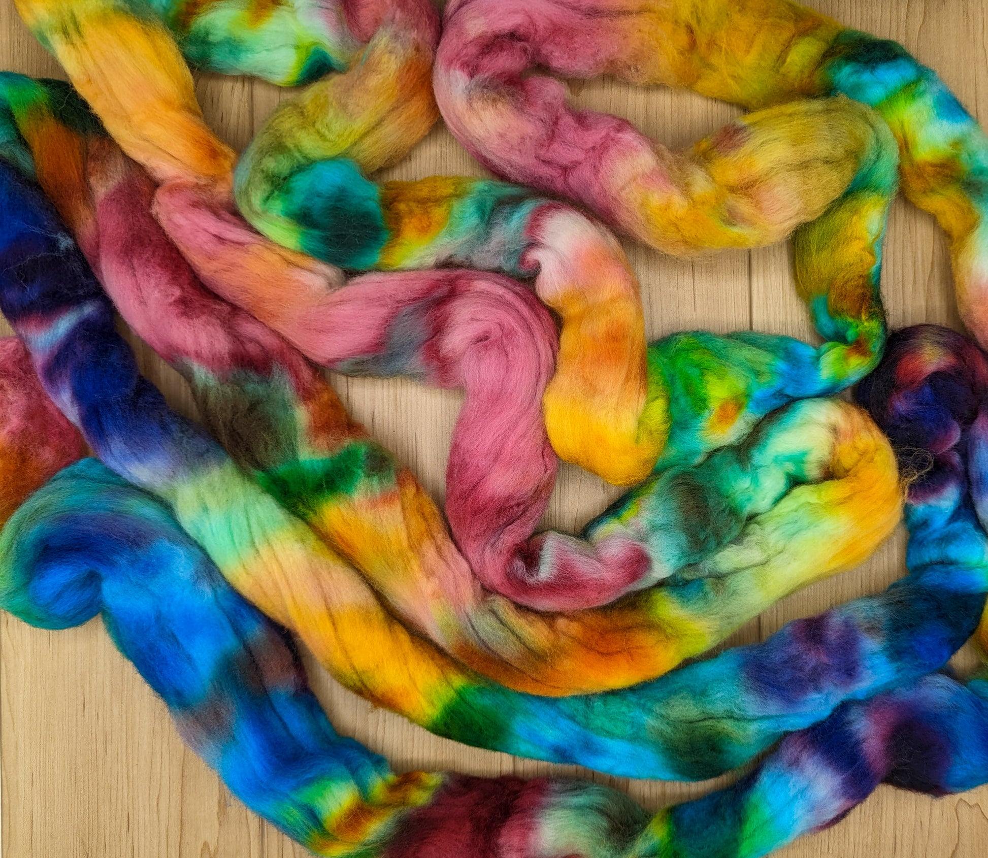 Classic Rainbow is one of our most popular and unique colorways. You can't go wrong with rainbow! A kaleidoscope of colors makes for fun spinning and a unique end product every time. This colorway is more variable and complex than others. It is recommended you get all you need for your current project in one dye lot.