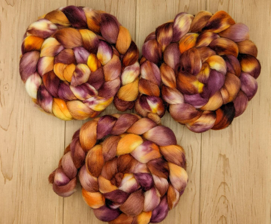 Each braid of individually dyed fiber contains approximately 4 ounces of wool. Shipping times are one week from order date. This roving is dyed to order. If it is in stock, shipping date will be 1-2 business days. There are two options for bases: