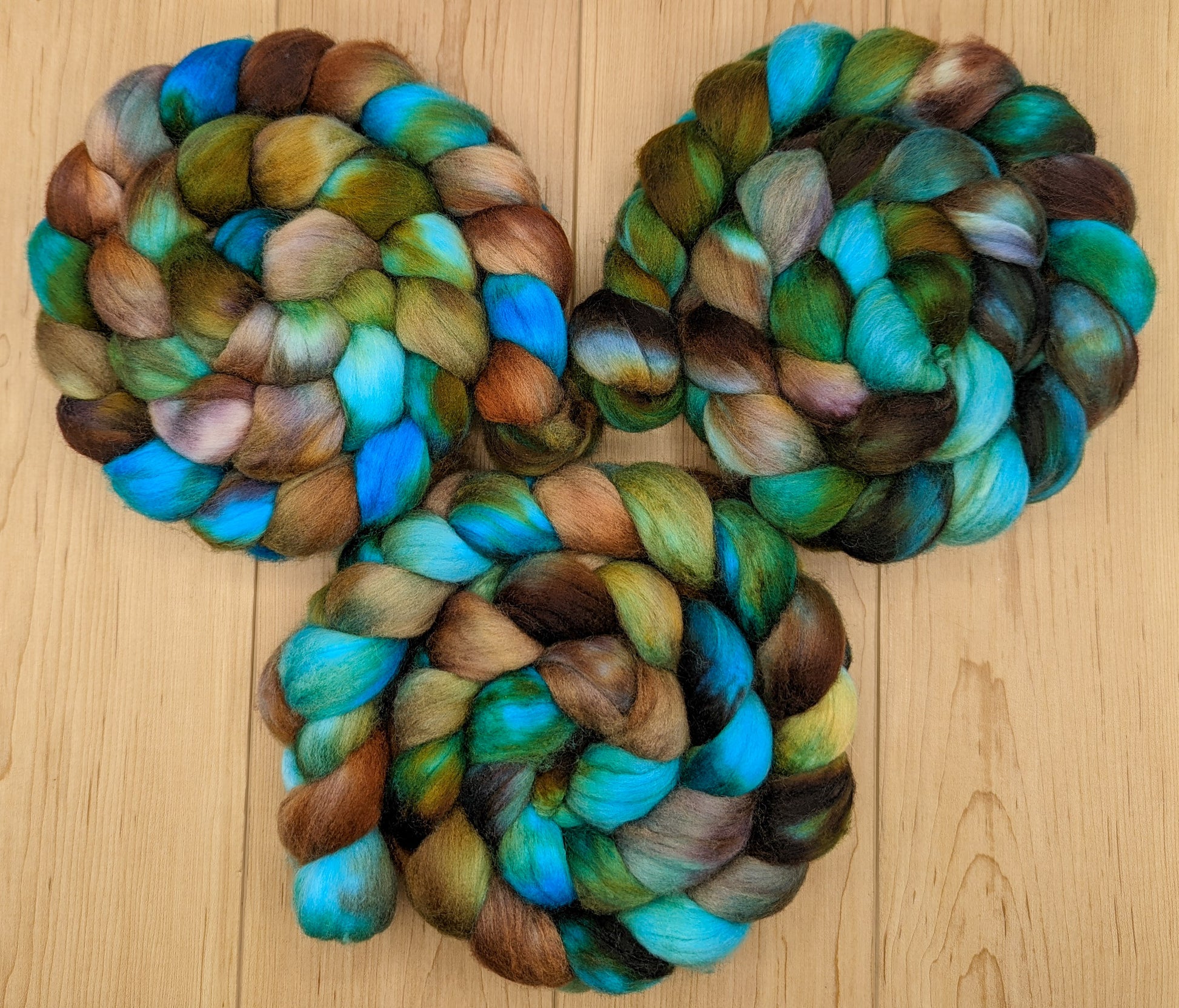 Each braid of individually dyed fiber contains approximately 4 ounces of wool. Shipping times are one week from order date. This roving is dyed to order. If it is in stock, shipping date will be 1-2 business days. There are two options for bases: