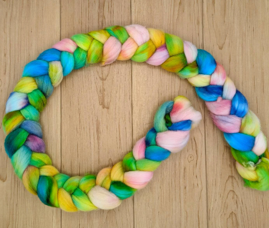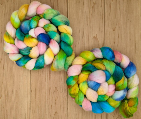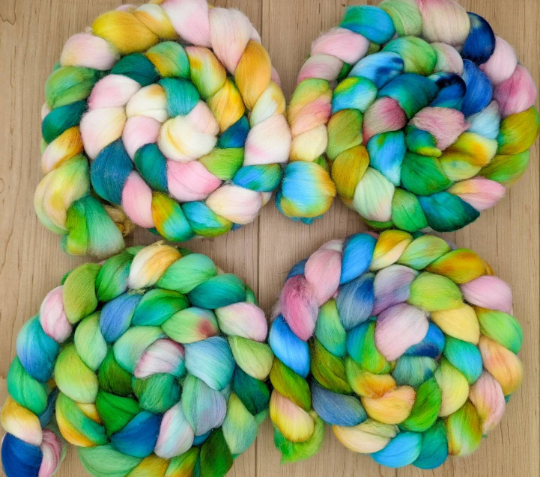 Each braid of individually dyed fiber contains approximately 4 ounces of wool. Shipping times are one week from order date. This roving is dyed to order. If it is in stock, shipping date will be 1-2 business days. There are two options for bases: